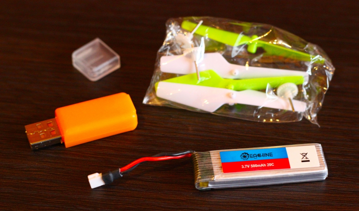 A doboz egyszerű, teljesen rendben van, a tartalma elég alap, kapjuk a gépet, egy darab aksit, töltőt, kézikönyvet (német és angol), taralék propellereket és tengelyeket, illetve a hordozó szütyőt.
