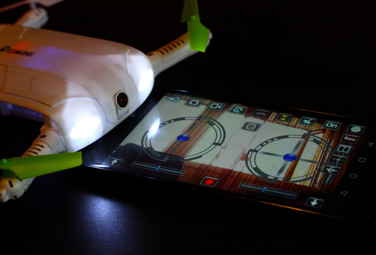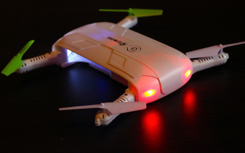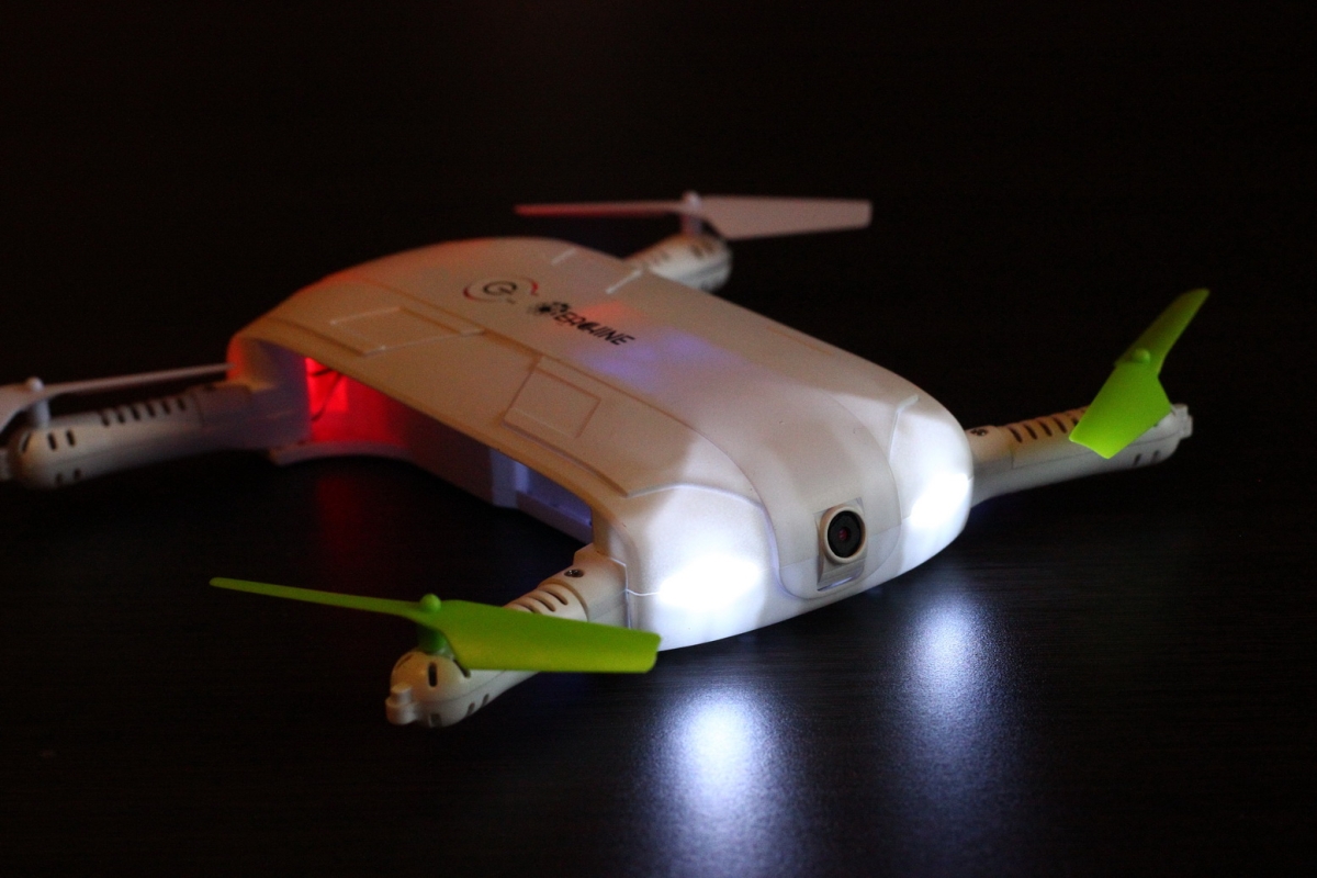 Kezdőknek kifejezetten hasznos segítségeket kapunk a dróntól, az első és hátsó propellerek színe más, elől fehér, hátul piros fények világítanak elég erősen, így könnyebb megállapítani az orientációt.