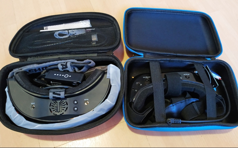 Nézzük szép sorban, itt van a szemüveg, ami elsőre nagynak és masszívnak hat, van egy hordtáska, ami szintén nem kicsi, minősége jó, erős, minden belefér. Kapunk tovább egy USB töltő kábelt, egy HDMI kábelt, 2 db szivacsot, az egyik vastagabb, egy második takarólemezt, melyen modul nyílás található, ha cserélnék a modulokat, dobozos, usb-ről tölthető aksit, kis törlőkendőt, és használati útmutató füzetecskét. Antennákat nem kapunk, mint pl. az Aomway szemüvege esetén, pedig itt 4 db is szükséges lesz, ha maximálisan ki akarjuk használni a quadversity lehetőségét. Megjegyzés, a quadversity csak a saját modulokkal működik!