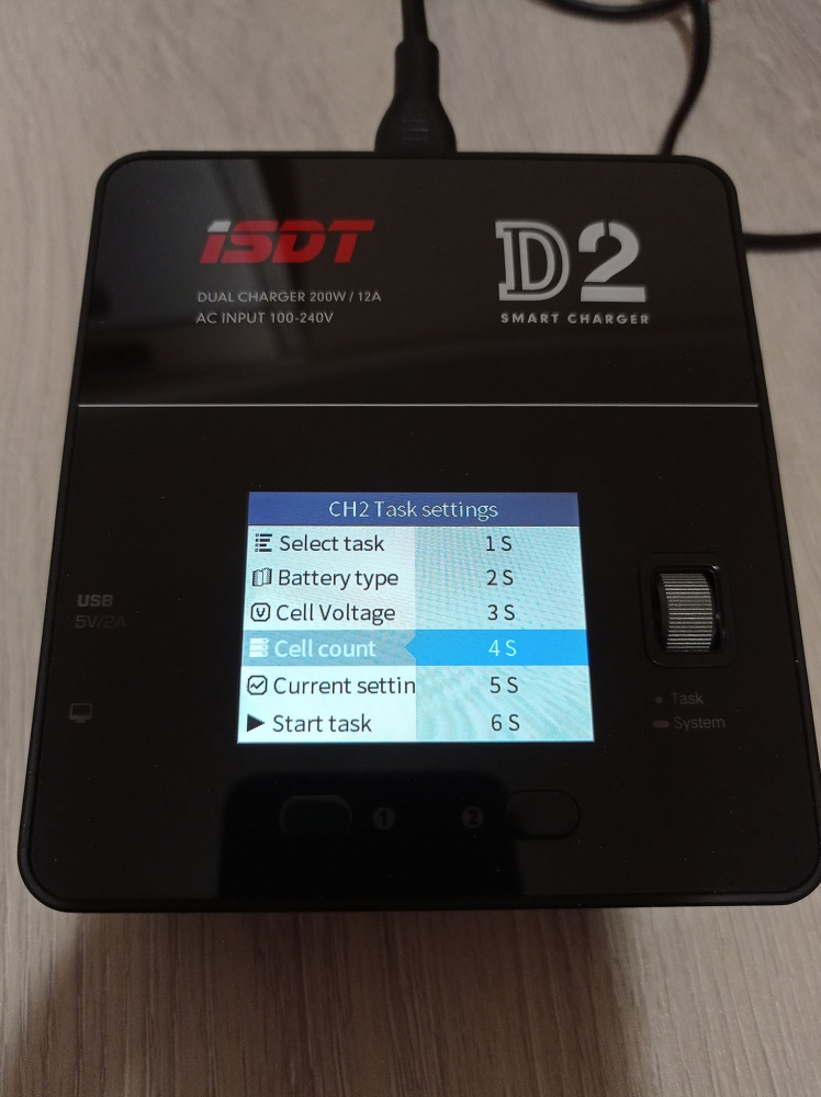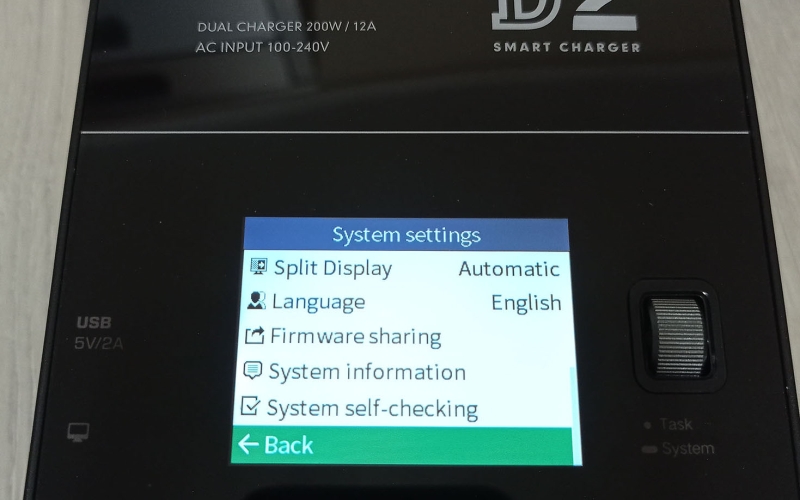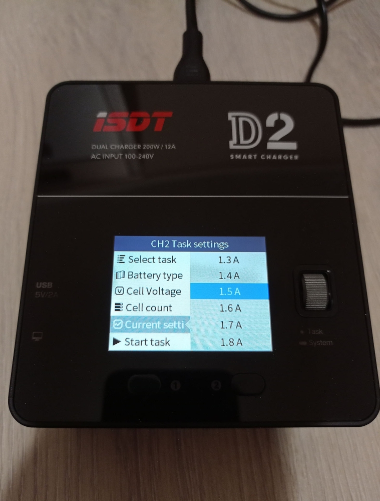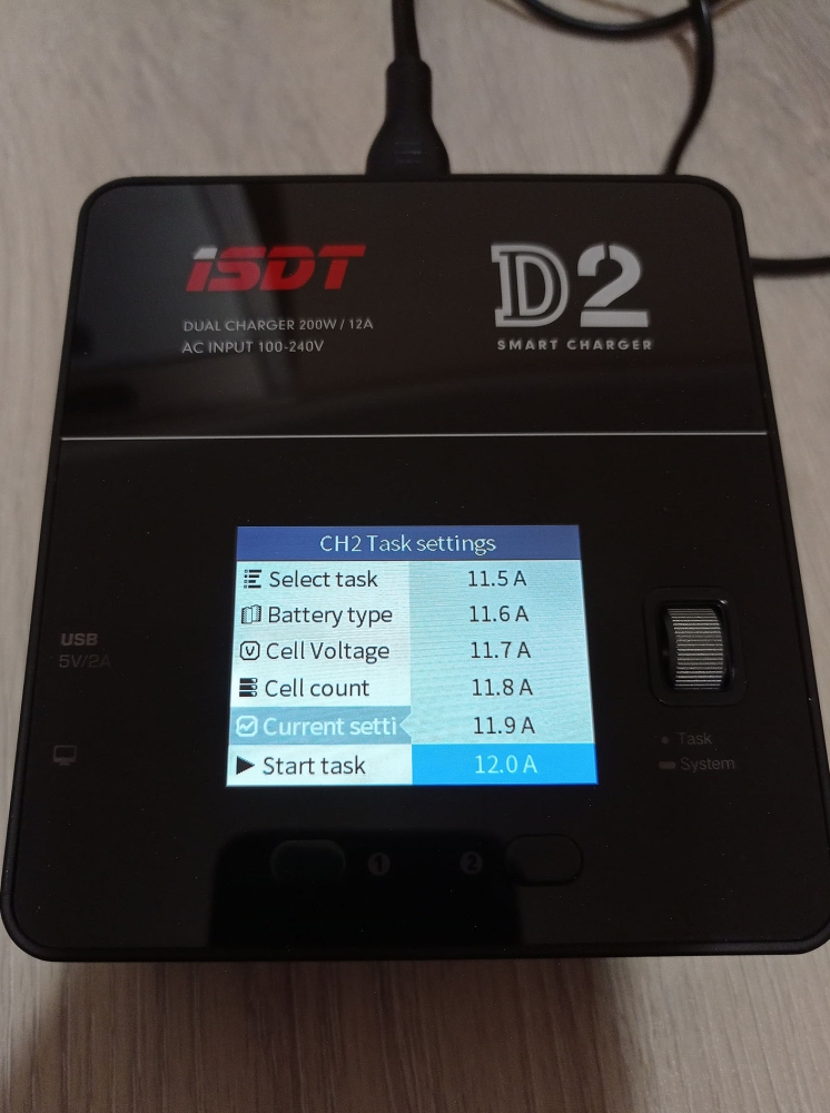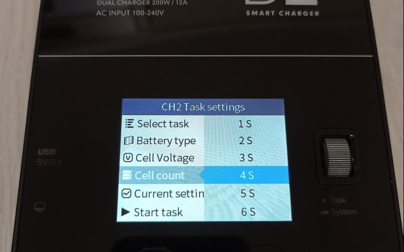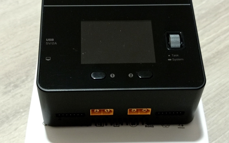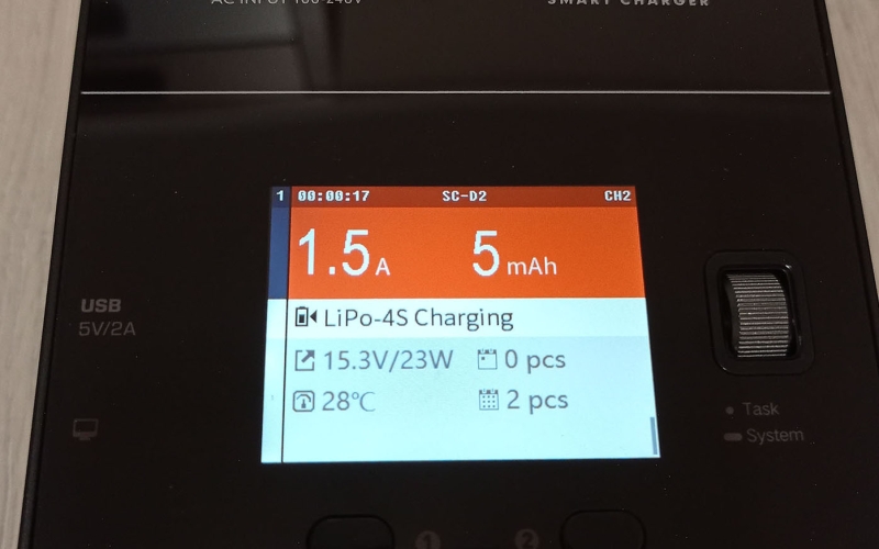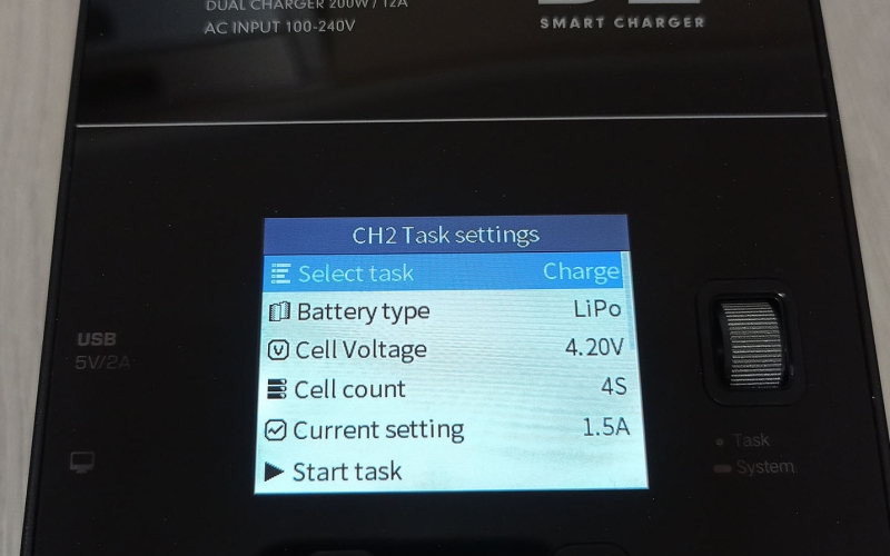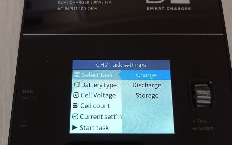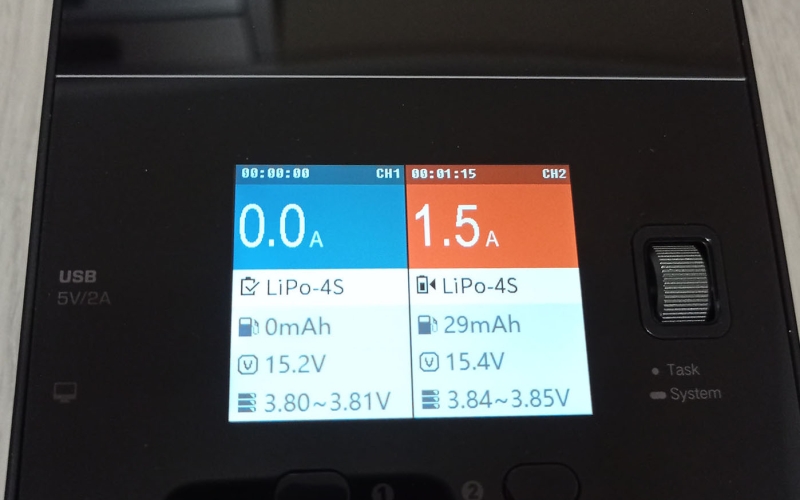 A töltő színes kijelzővel rendelkezik, amin nyomon követhetjük mindkét csatorna állapotát, és elvégezhetjük a különböző beállításokat, ezekről a cikk végén találhattok képeket a galériában. A menü használata egyébként rém egyszerű, beállítjuk a töltési módot, az akksi típusát (LiHv, LiPo, LiIon, LiFe, Pb, NiMH/Cd) a cella feszültéséget és cella számot (2S-6S, ezt automatán felismeri) és hogy hány amperrel akarjuk tölteni. A cella feszültséget század, a töltési áramot tized pontosággal határozhatjuk meg. Ezután start task, és már indul is a töltés/merítés.