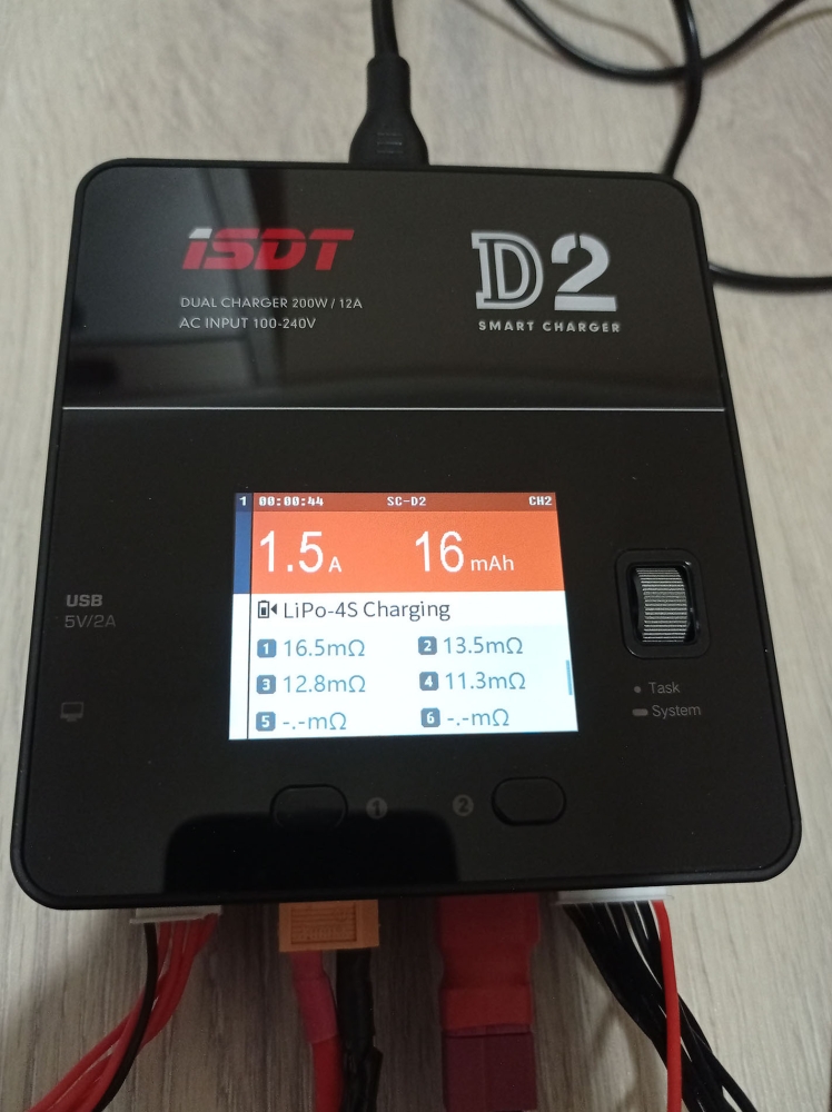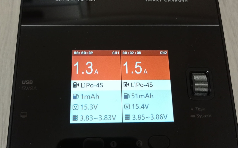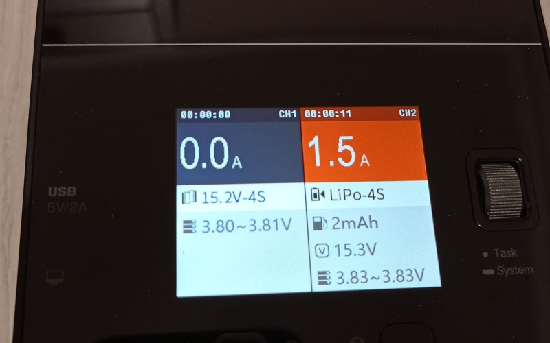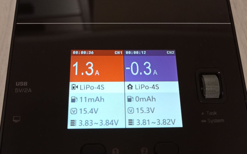 Töltés közben a 320x240px-es 2.4 colos IPS LCD kijelzőn mindkét csatorna töltési adatai láthatók, úgymint a töltési amper, bepumpált mAh, összfeszültség és cellák feszültség tartománya. Amennyiben részleteseb adatokat akarunk, akkor az 1-es és 2-es gombok megnyomásával láthatjuk a cellánkénti feszültésget és a belső ellenállást is. A töltési állapotot egyébként színekkel is jelzi a készülék, narancs a töltés, lila a merítés és szürke az elkészült feladat esetén. Hasznos funkció ez, mert akár messzebbről ránézve is tudjuk mi történik, készen van a töltés. A feladat végét egyébként ismétlődő csipogással jelzi.