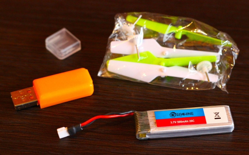 A doboz egyszerű, teljesen rendben van, a tartalma elég alap, kapjuk a gépet, egy darab aksit, töltőt, kézikönyvet (német és angol), taralék propellereket és tengelyeket, illetve a hordozó szütyőt.