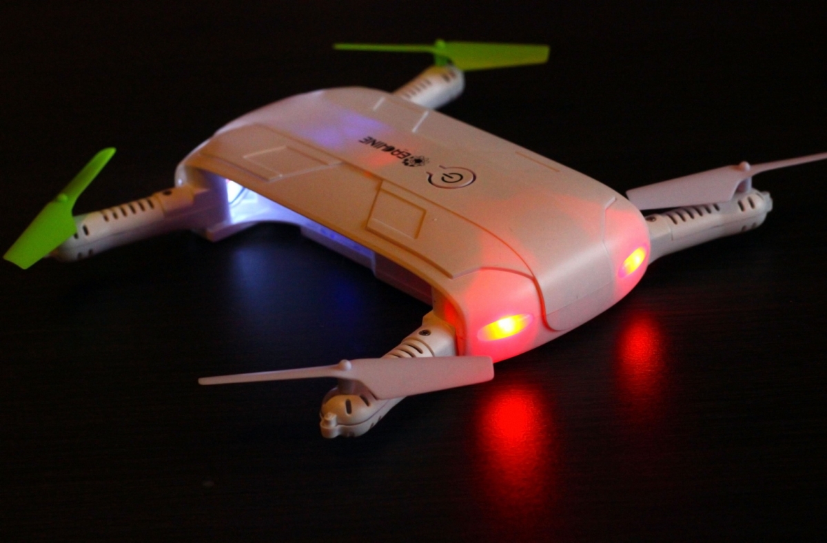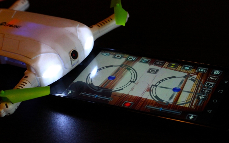 Kezdőknek kifejezetten hasznos segítségeket kapunk a dróntól, az első és hátsó propellerek színe más, elől fehér, hátul piros fények világítanak elég erősen, így könnyebb megállapítani az orientációt.