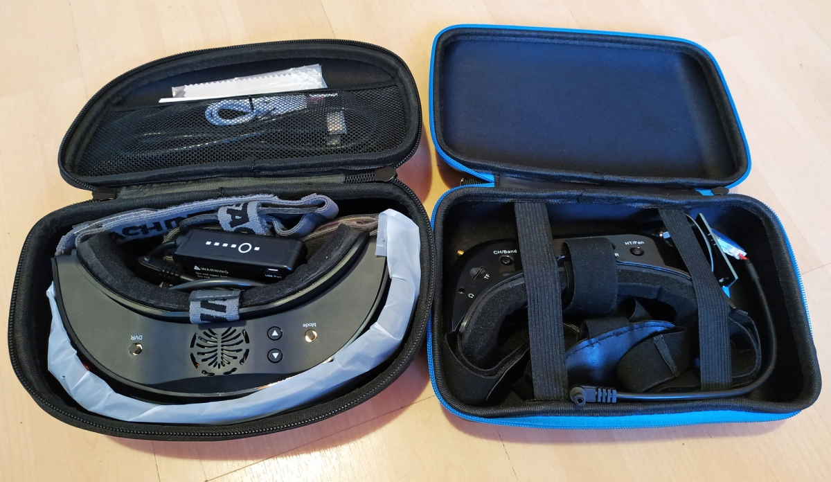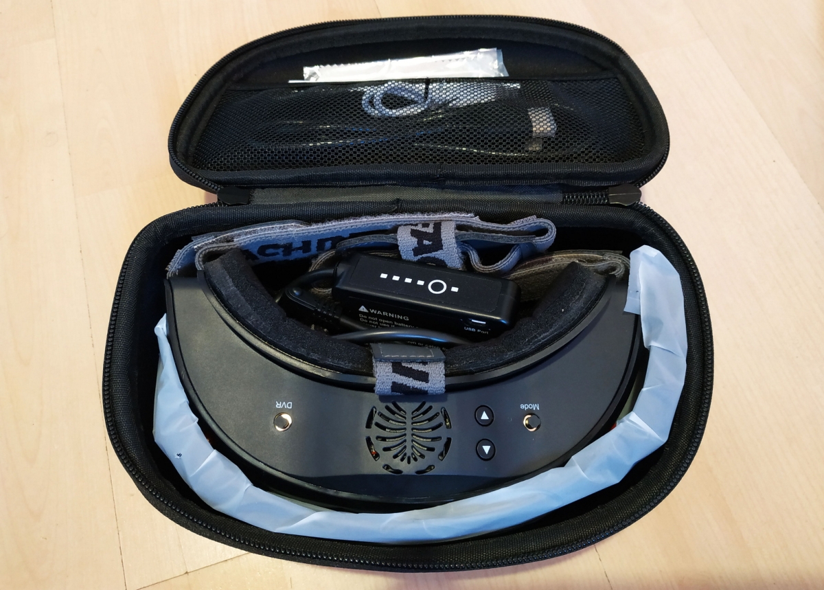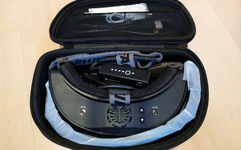 Nézzük szép sorban, itt van a szemüveg, ami elsőre nagynak és masszívnak hat, van egy hordtáska, ami szintén nem kicsi, minősége jó, erős, minden belefér. Kapunk tovább egy USB töltő kábelt, egy HDMI kábelt, 2 db szivacsot, az egyik vastagabb, egy második takarólemezt, melyen modul nyílás található, ha cserélnék a modulokat, dobozos, usb-ről tölthető aksit, kis törlőkendőt, és használati útmutató füzetecskét. Antennákat nem kapunk, mint pl. az Aomway szemüvege esetén, pedig itt 4 db is szükséges lesz, ha maximálisan ki akarjuk használni a quadversity lehetőségét. Megjegyzés, a quadversity csak a saját modulokkal működik!