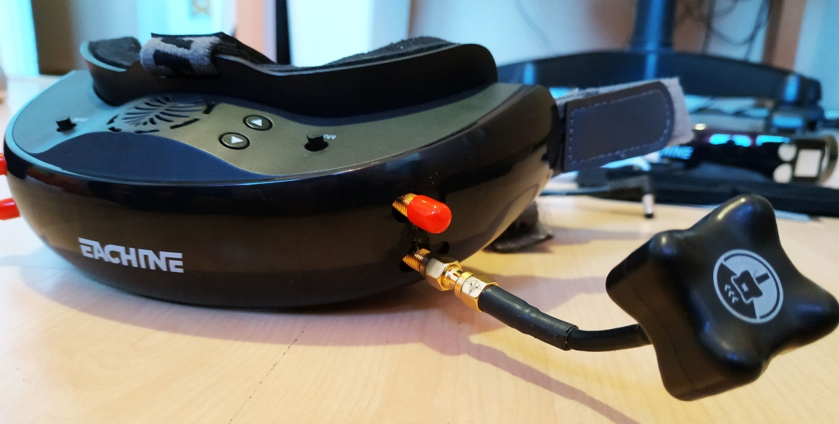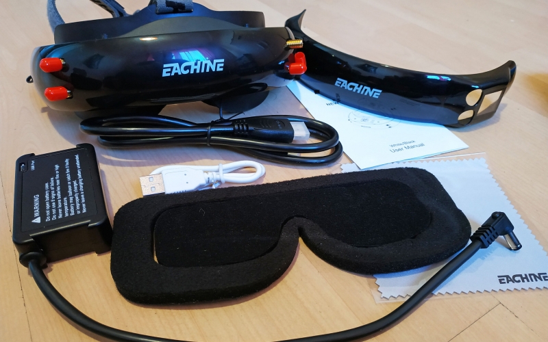 szemüveg anyagminősége amolyan közepes, rendben van, úgysem ez a lényeg. Egyedül talán a DVR és MODE joystickokra lehet panasz, nincs lekerekítve, szinte karcol mikor használjuk. Az összeszerelés rendben van, nem recseg, nem ropog, van benne anyag, ami a súlyon viszont nem kicsit látszik. Már ahogy felemeljük, érezhetjük, hogy ez bizony több a megszokottnál... Az EV200D súlya akku nélkül kereken 300g... Összehasonlítás képpen a korábban tesztelt Aomway szemüveg csak 180g! Ha az aksit is rárakjuk, akkor 398g lesz a fejünkön. Ez még a beépített aksis EV800D doboz szemcsinél is több, az is csak 378 gramm. Mit jelent ez a gyakorlatban? Azt kell mondjam hogy nemsokat. Fejre felvéve, miután felraktam a vastagabb szivacsot és a felső fejpántot is, egész kényelmes, talán még kényelmesebb is mint a könnyebb Aomway. Ez adódhat a jobb szivacs, fejpánt és méret miatt, ez jobban passzol a fejemre. Persze ez simán fejméret függő, másnak lehet kényelmetlen, ezért is mondjuk mindig, keressetek fel pár FPV srácot, és próbáljátok fel mi a nektek kényelmes, ez nagyon fontos, nem lesz jó feeling kényelmetlen szemcsivel repülni.