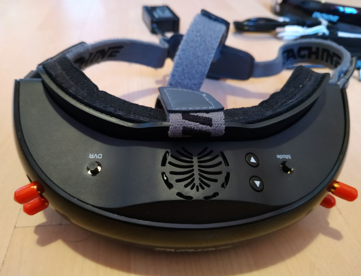 Az IPD 56-72mm között állítható, és a lencsék elé használhatjuk a Fatshark dioptriás előtét lencséit is. Itt találunk még USB csatlakozót FW frissítéshez, audio jack aljzatot, HDMI és AV bemenetet, és egy FAN 0-1 kapcsolót, amire nem jöttem rá mire jó, mert hogy ki nem kapcsolja az tuti, a manual sem ír róla semmit csak FAN on/off :)