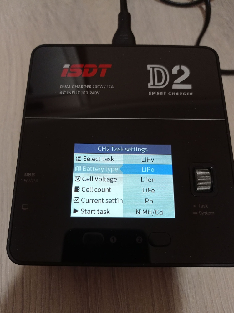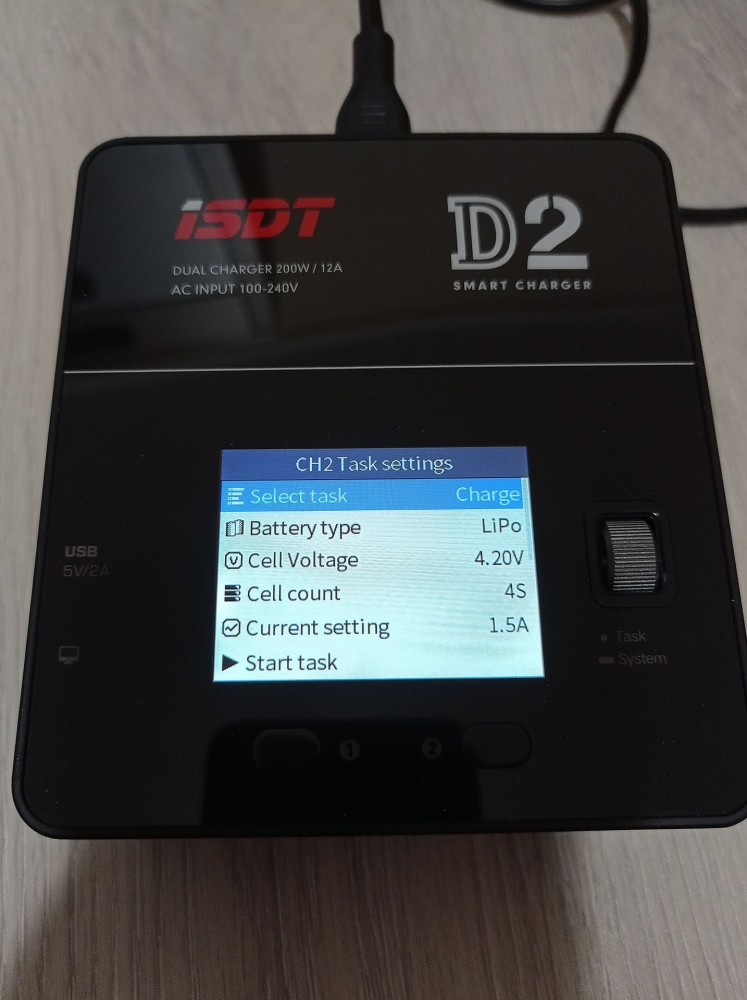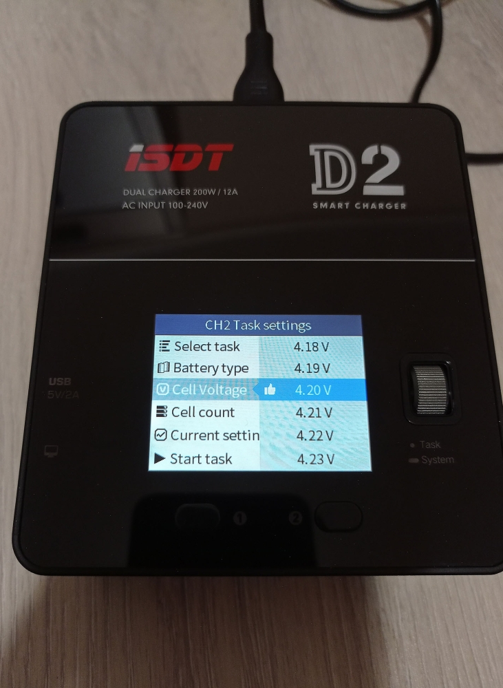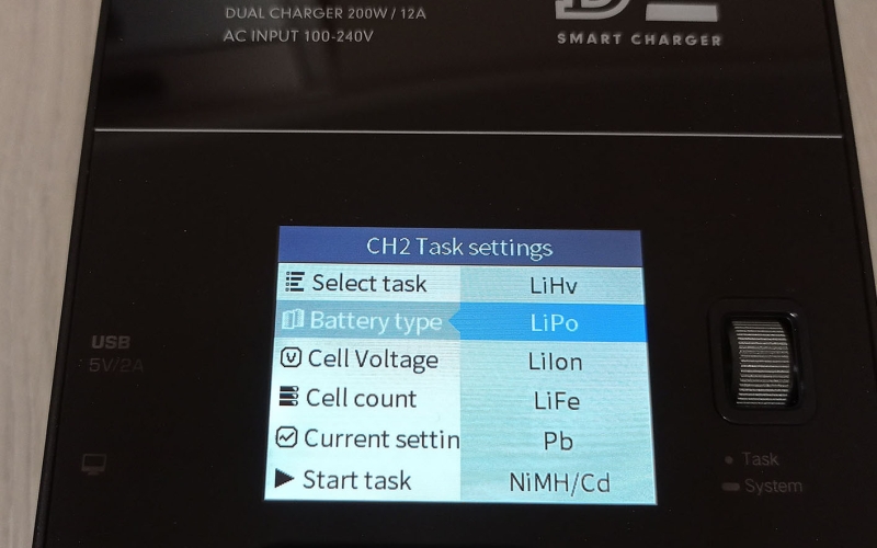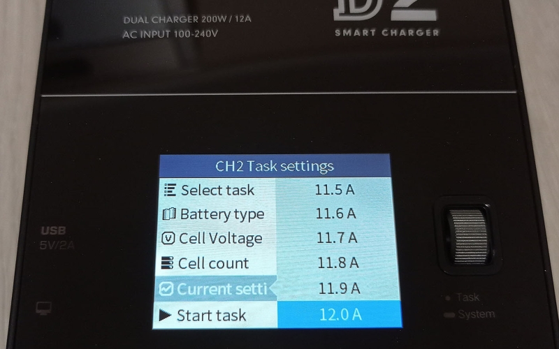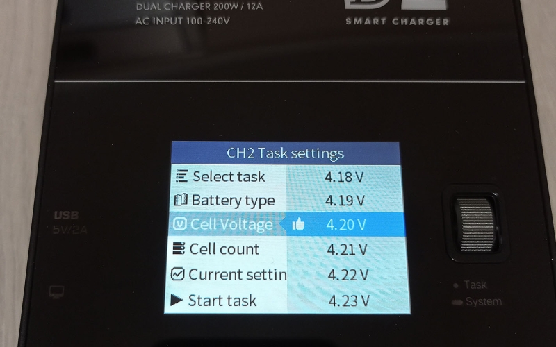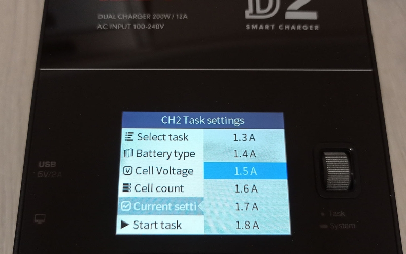 A töltő színes kijelzővel rendelkezik, amin nyomon követhetjük mindkét csatorna állapotát, és elvégezhetjük a különböző beállításokat, ezekről a cikk végén találhattok képeket a galériában. A menü használata egyébként rém egyszerű, beállítjuk a töltési módot, az akksi típusát (LiHv, LiPo, LiIon, LiFe, Pb, NiMH/Cd) a cella feszültéséget és cella számot (2S-6S, ezt automatán felismeri) és hogy hány amperrel akarjuk tölteni. A cella feszültséget század, a töltési áramot tized pontosággal határozhatjuk meg. Ezután start task, és már indul is a töltés/merítés.
