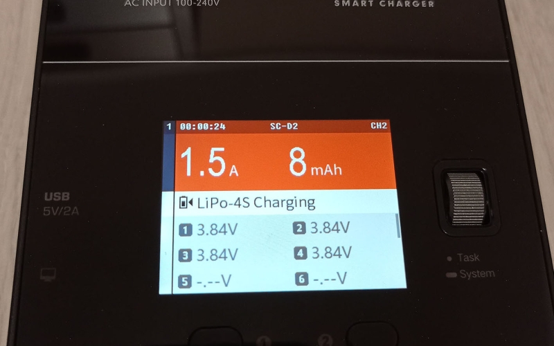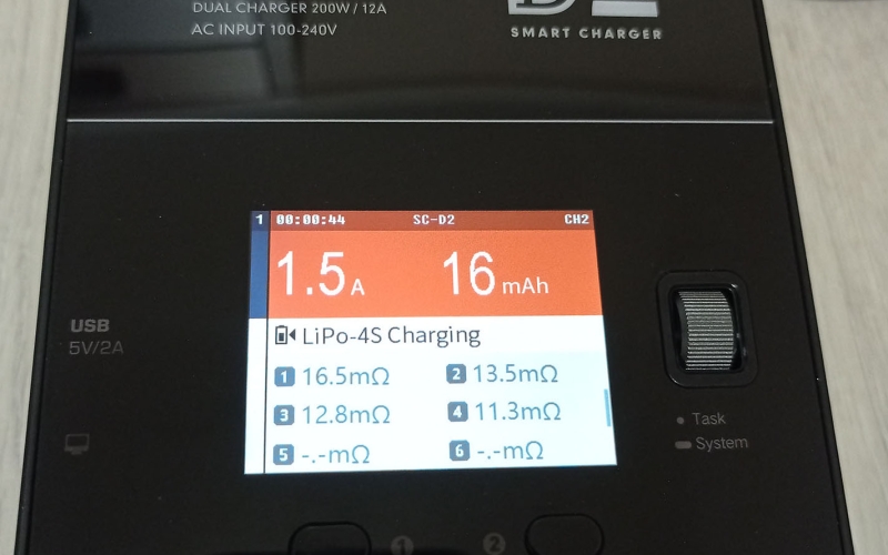 Töltés közben a 320x240px-es 2.4 colos IPS LCD kijelzőn mindkét csatorna töltési adatai láthatók, úgymint a töltési amper, bepumpált mAh, összfeszültség és cellák feszültség tartománya. Amennyiben részleteseb adatokat akarunk, akkor az 1-es és 2-es gombok megnyomásával láthatjuk a cellánkénti feszültésget és a belső ellenállást is. A töltési állapotot egyébként színekkel is jelzi a készülék, narancs a töltés, lila a merítés és szürke az elkészült feladat esetén. Hasznos funkció ez, mert akár messzebbről ránézve is tudjuk mi történik, készen van a töltés. A feladat végét egyébként ismétlődő csipogással jelzi.